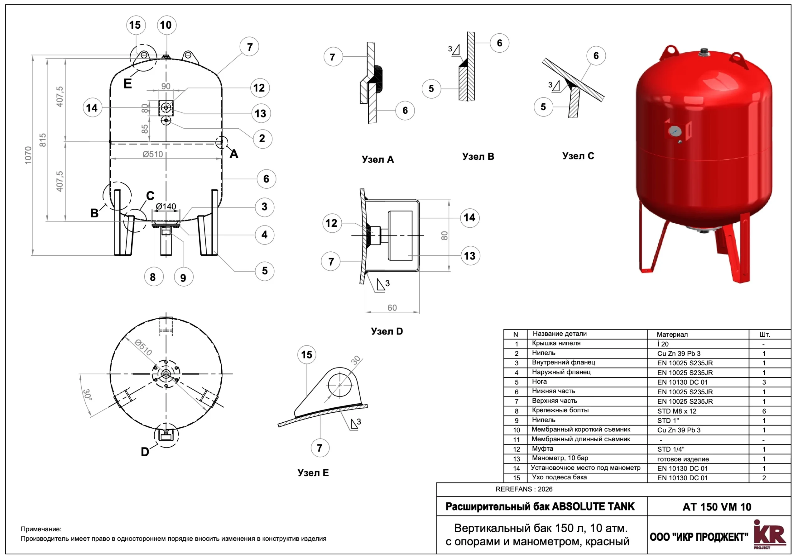 Материал: Корпус бака, опоры — углеродистая сталь, покрытая порошковой краской красного цвета, RAL 3000