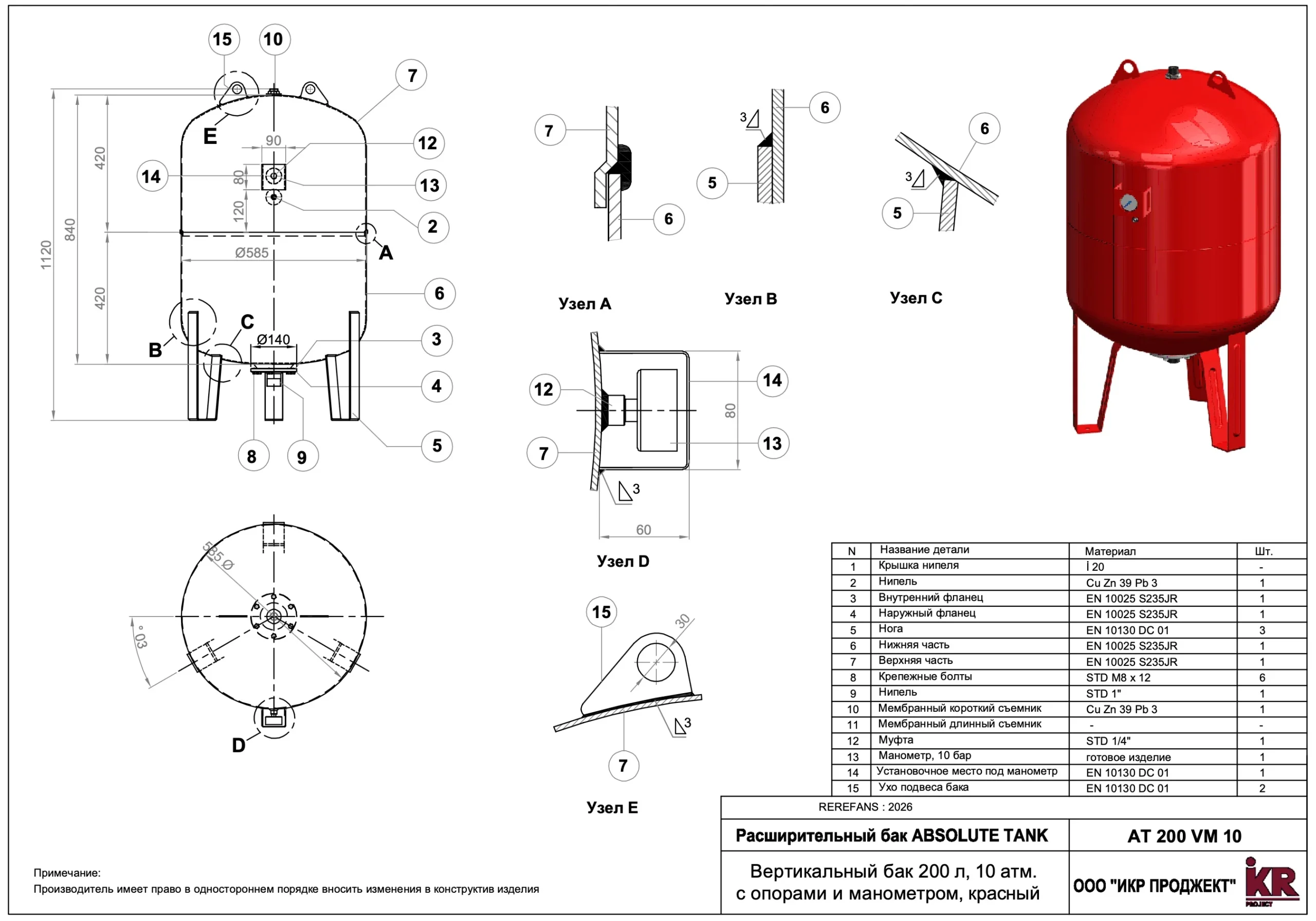 Материал: Корпус бака, опоры — углеродистая сталь, покрытая порошковой краской красного цвета, RAL 3000
