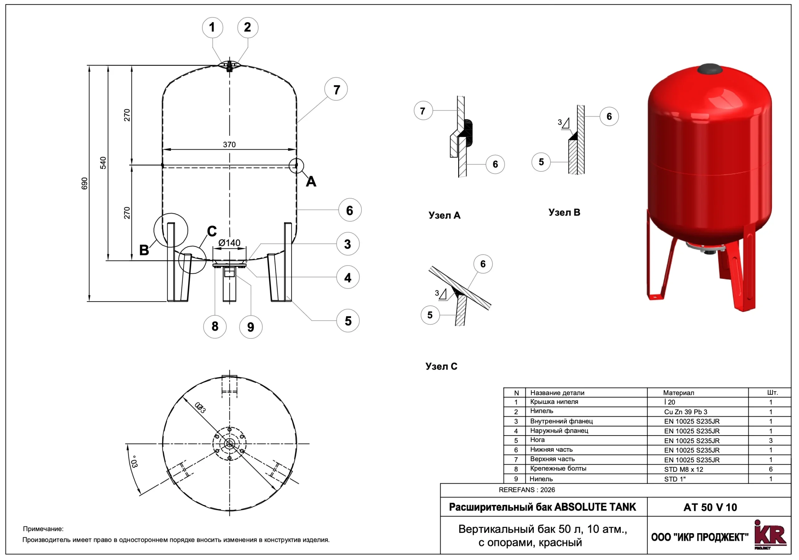 Материал: Корпус бака, опоры — углеродистая сталь, покрытая порошковой краской красного цвета, RAL 3000