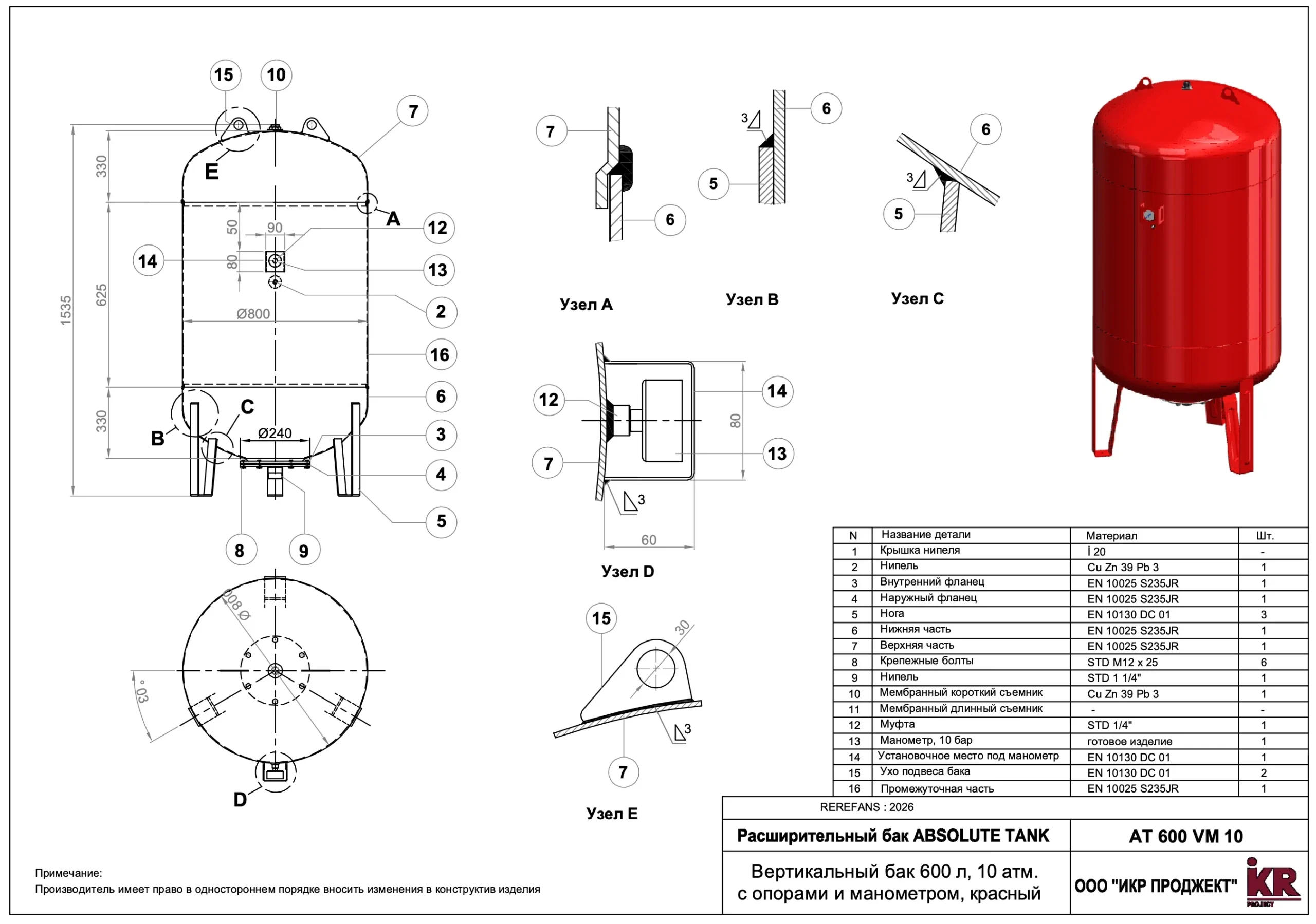 Материал: Корпус бака, опоры — углеродистая сталь, покрытая порошковой краской красного цвета, RAL 3000