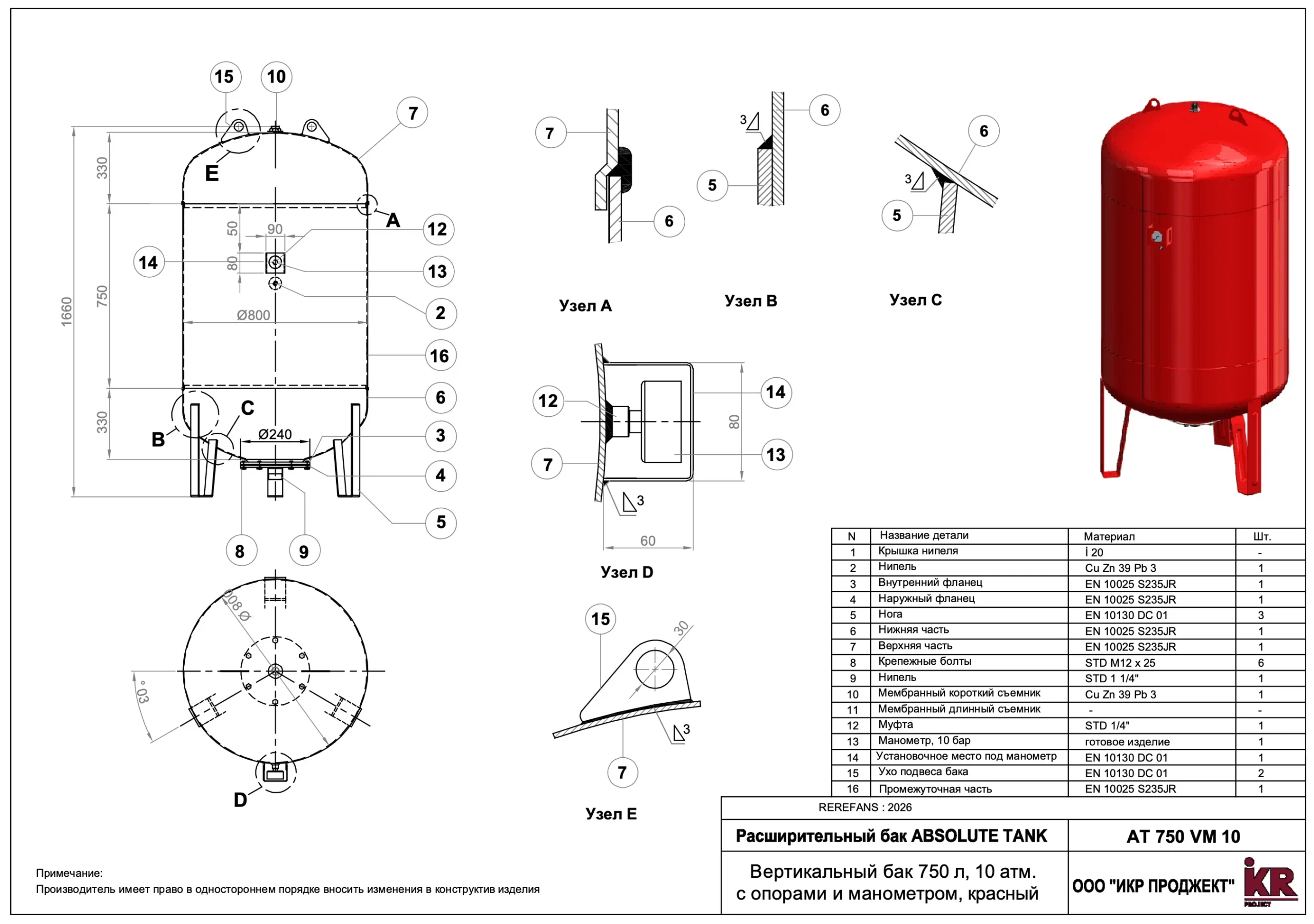 Материал: Корпус бака, опоры — углеродистая сталь, покрытая порошковой краской красного цвета, RAL 3000