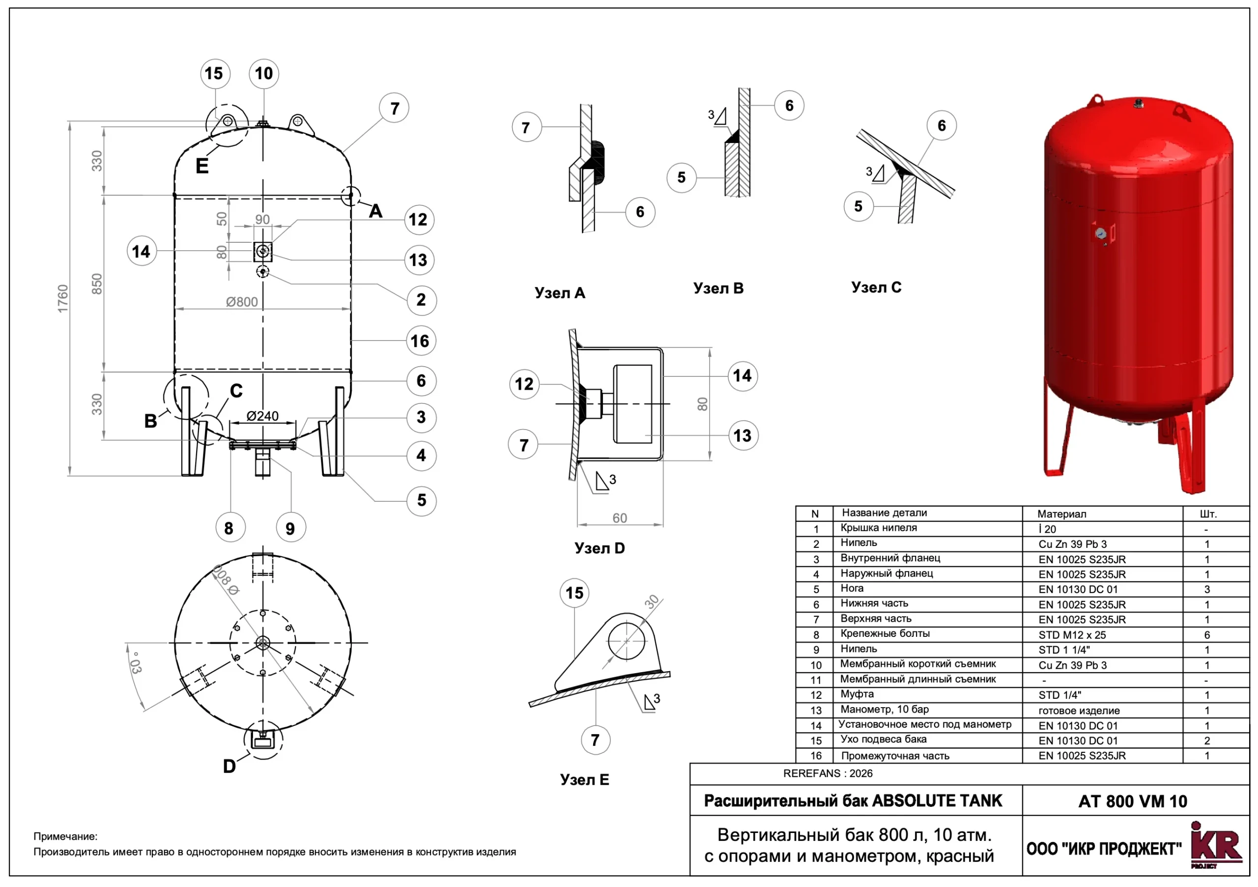 Материал: Корпус бака, опоры — углеродистая сталь, покрытая порошковой краской красного цвета, RAL 3000